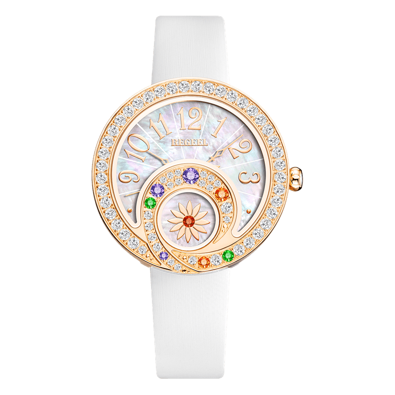 隨后,理查德米爾(Richard Mill)推出了一款采用“雪花鑲嵌”技術的女表,為腕表增添了光彩和醒目。雪花鑲嵌工藝,又稱“微釘鑲嵌”,顧名思義,是極其細致的。選用直徑在0.5mm-1.6mm的寶石,鑲嵌爪手工制作,在40倍顯微鏡下固定。大小不一的寶石之間的貼合距離高達微米,沒有任何金屬爪的痕跡。寶石在整個鑲嵌面上交替排列,呈現出流暢兼收并蓄的視覺效果,宛如白雪覆蓋,光彩流轉。