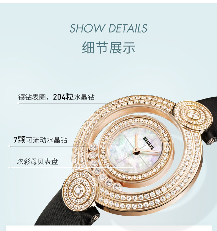 盤面布局采用了大家熟悉的“DD”設計,3點鐘有日期顯示窗口,6點鐘有扇形窗口顯示星期,一目了然。仔細觀察可以發現,藍色圓盤上點綴著太陽光,與立體羅馬時標、軌道刻度巧妙搭配,充滿時尚感。
